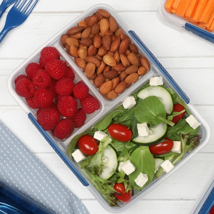 Med ett stort och två små fack för att hålla din mat åtskild tills den ska ätas.