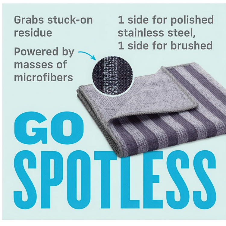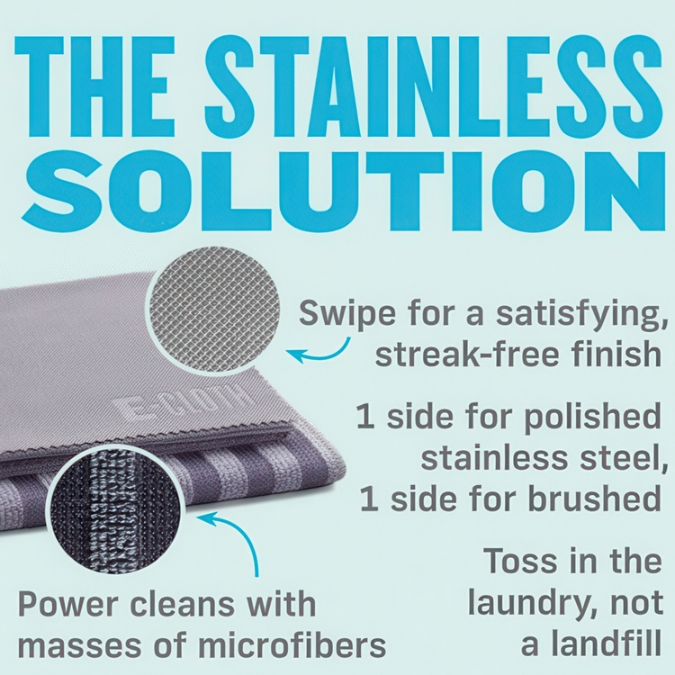 En polerduk för rostfritt stål med en mjuk polerande sida och en grövre sida för att skrubba bort fläckar med.