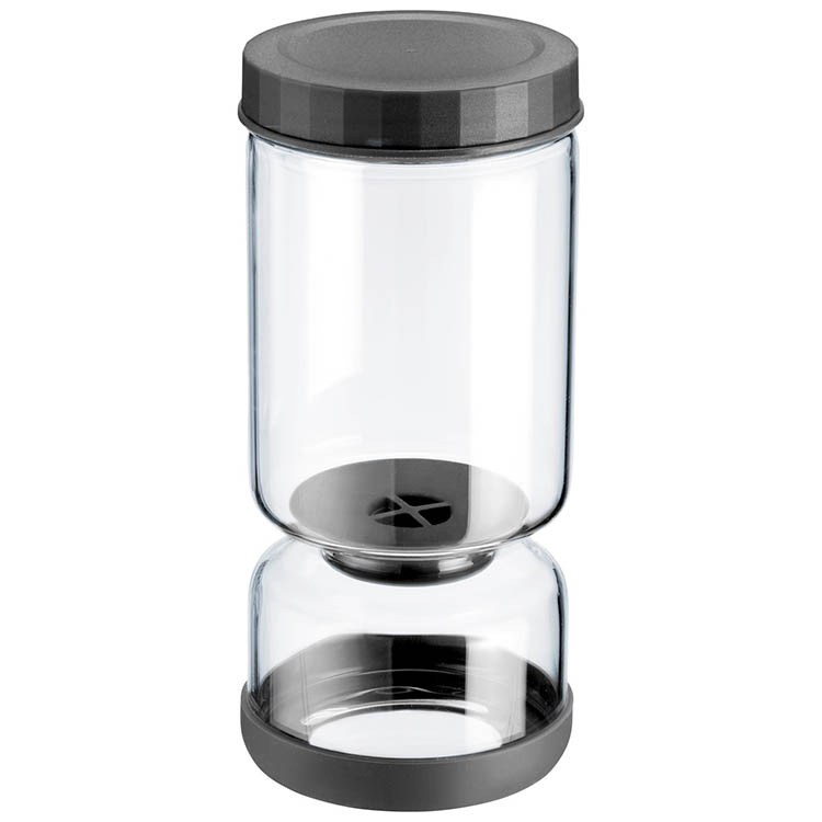 Smart olivburk för dig som vill servera oliver, cornichoner eller andra små delikatesser som förvaras i spad. Tack vare det integrerade tvåkammarsystemet behöver du bara vända burken upp och ner för att låta vätskan rinna bort inför servering – snabbt, enkelt och utan extra kärl. Den smala designen gör att burken tar minimalt med plats i kylskåpet och alltid är redo att ställas direkt på bordet. Burken tål maskindisk.