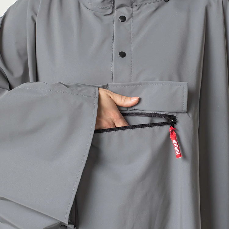 När regnponchon inte används packas den enkelt ihop i sin egen integrerade förvaringspåse. Under användning fungerar påsen istället som en praktisk ficka, perfekt för nycklar eller andra småsaker. För att packa ner regnponchon, vik ihop den, vänd förvaringsfickan ut och in och stoppa ponchon i påsen.Specifikationer