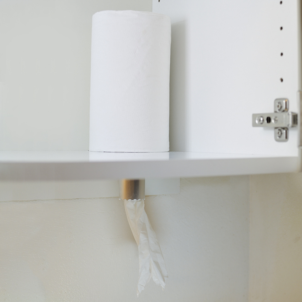 Mät upp var du vill att rullen ska stå och borra ett 40 mm hål i den nedersta hyllan i skåpet. Tryck ner rivröret genom hyllplanet, trä igenom pappret och ställ torkpappersrullen ovanpå rivröret. Du kan nu dra ut och riva av pappret samtidigt som rullen är helt dold inuti skåpet!