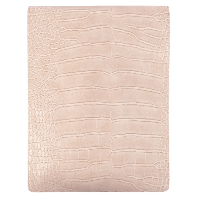 iPadväskan är tillverkad av exklusivt veganskt läder och finns i svart färg eller i en rosa färg med krokodil-inspirerat mönster.
