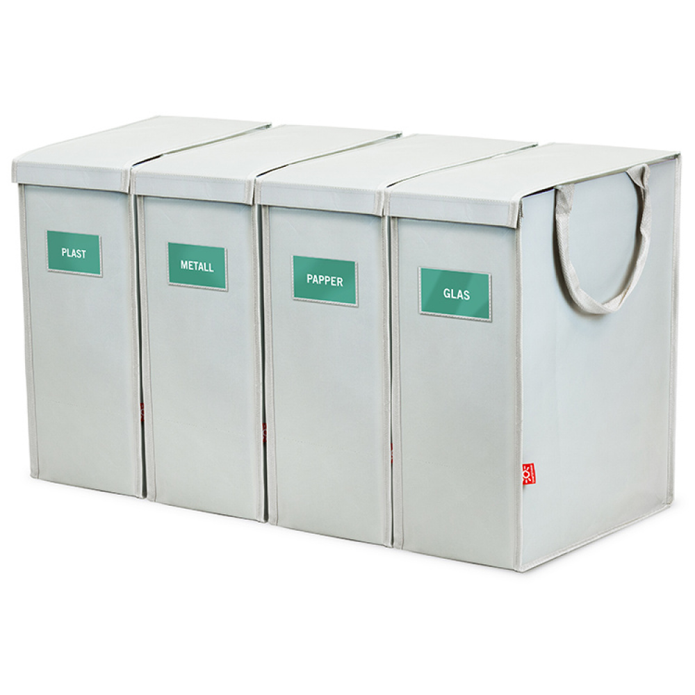 De här smarta källsorteringskassarna har lock, starka handtag och praktiska skyltar som gör det enkelt att källsortera och återvinna dina hushållssopor. De fyra källsorteringskassarna är något smalare än andra liknande kassar vilket gör dem lättare att få plats med både hemma och på jobbet.