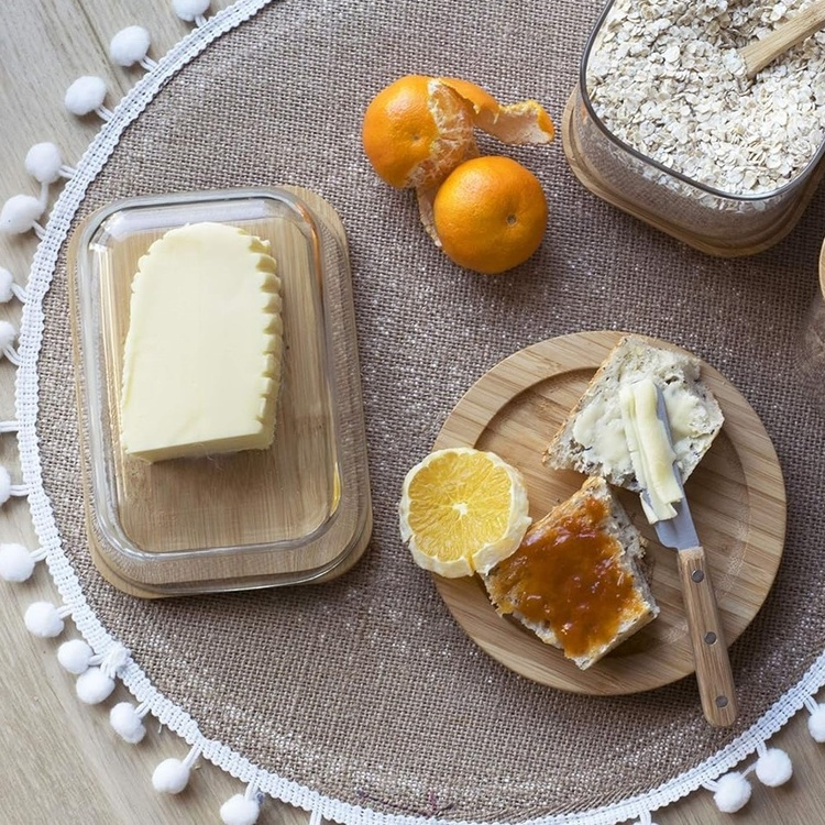 Lyxig smörbytta med bricka i bambu och lock i kraftigt glas.