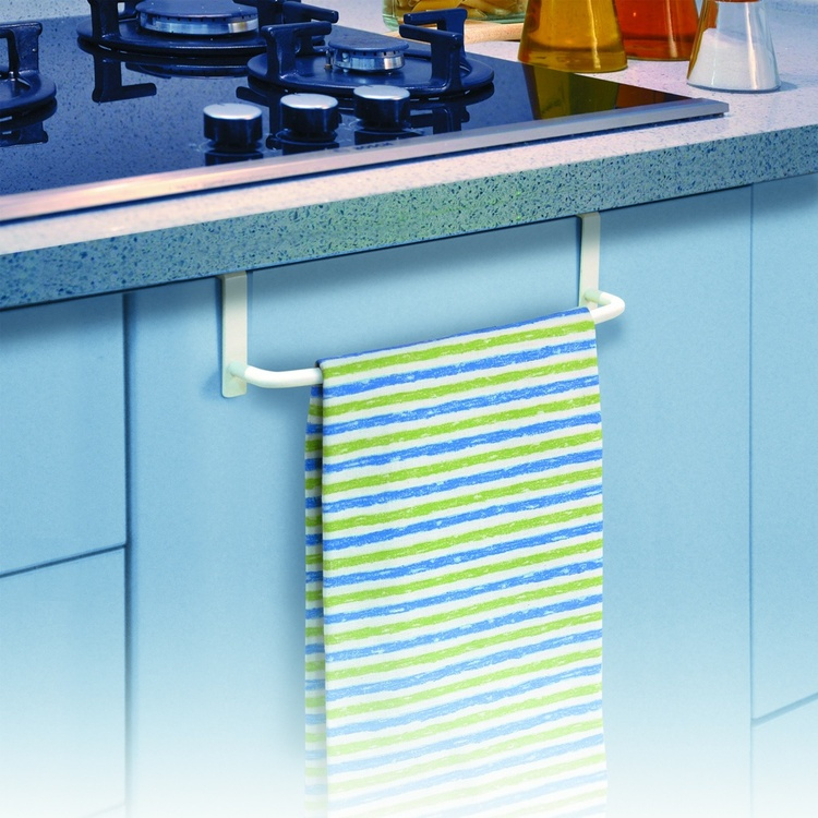 En handdukskrok/stång från Rayen. Hängs enkelt över skåpdörren eller lådan. Inga skruvar eller lim behövs. Ser snyggt ut och är platsbesparande.
