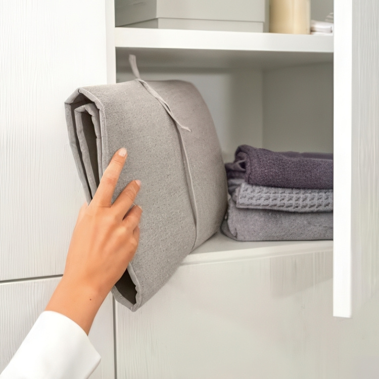 Kompakt förvaring - hopfällbar och med knytsnöre. När filten inte används viker du ihop den och förvaras den på en hylla eller i en låda. -