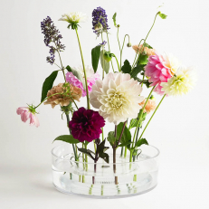 Med 23,5 cm i diameter och 7 cm i höjd ger vasen en bred yta för luftiga och balanserade blomsterarrangemang. Den låga profilen låter blommorna ta plats och ger samtidigt en stabil grund som är lätt att arbeta med. Det transparenta, minimalistiska utseendet framhäver både färska och torkade växter på ett stilrent sätt.Vas i kristallklar akryl