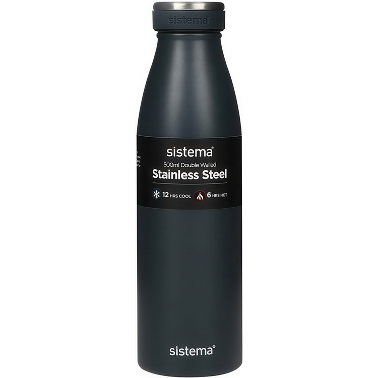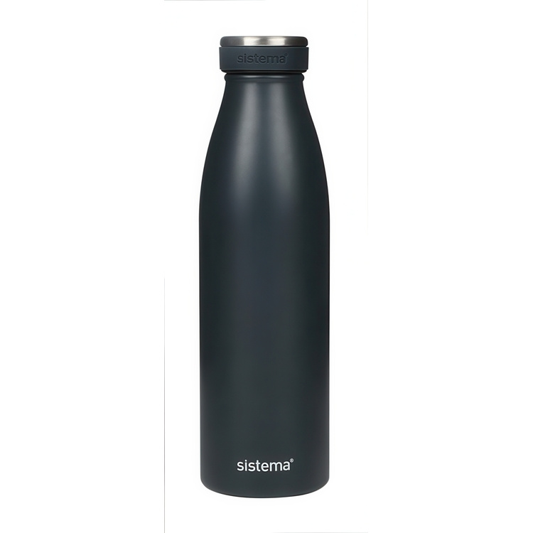 Flaska i rostfritt stål med dubbelväggisolering från Sistema. Håller kallt kallt och varmt varmt. Fyll bara på flaskan och stäng locket.