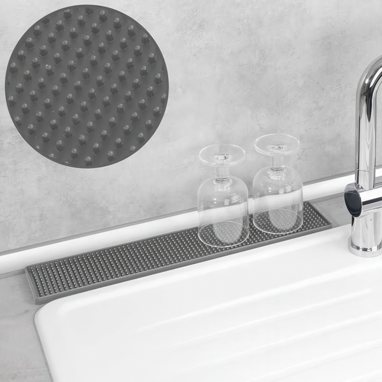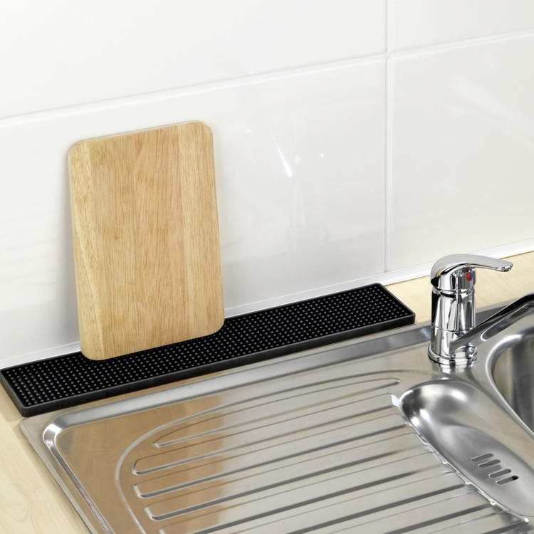 Torka dina vinglas på brickan. Eller placera torkmattan bakom vattenkranen och låt skärbrädor eller brickor torka där. Vattnet samlas på brickan. -