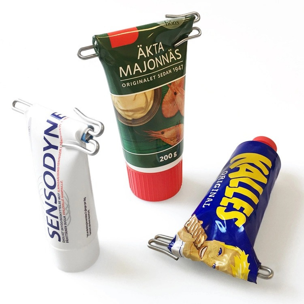 Tubklämma i metall som klämmer ut det sista ur både kaviar-, och tandkrämstuber. Det smarta låset håller tuben hoprullad vilket gör tubklämman utmärkt att använda även till plasttuber som annars lätt rullar upp sig själva.