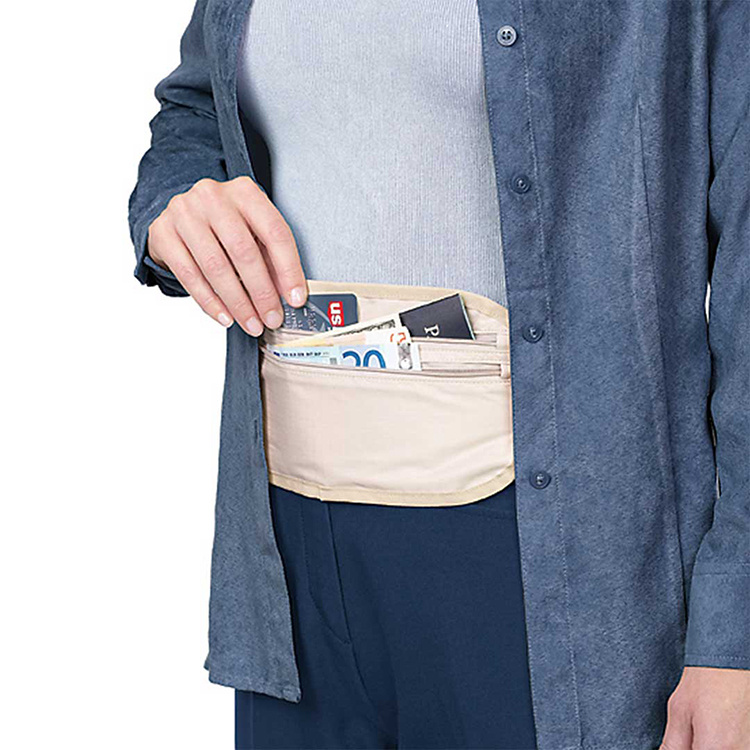 Midjeväskan är konstruerad så att den enkelt göms under tröjor, skjortor eller jackor. Den diskreta designen gör den perfekt för resor där du inte vill dra uppmärksamhet till dina värdesaker. Det elastiska bältet passar midjemått upp till 112 cm. Spännet håller väskan säkert på plats, oavsett om du går, sitter eller rör dig mycket. Midjeväskan är också fodrad med RFID-blockerande material som förhindrar trådlös skimning.Lätt och slitstark