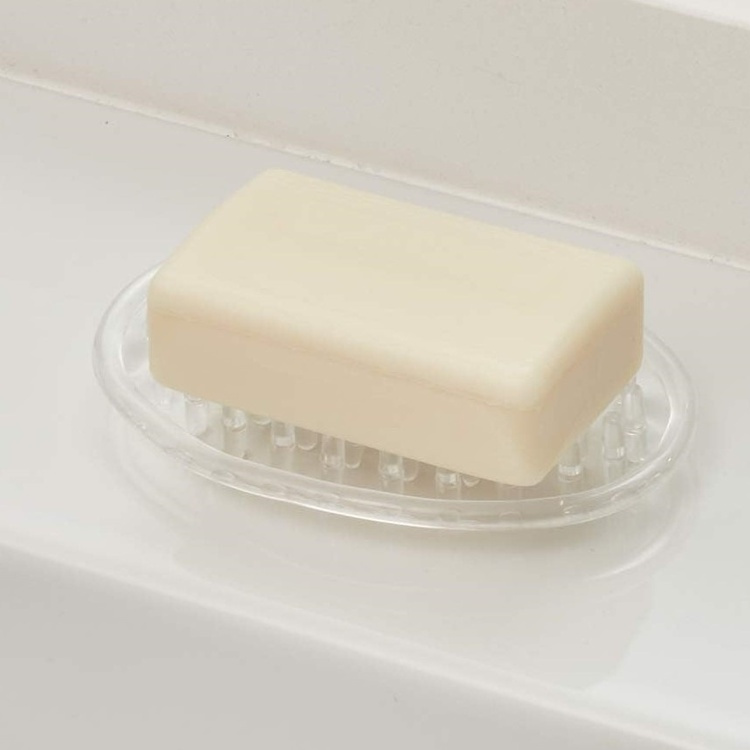 Med hål så att överskottsvatten kan rinna ut och med piggar på både över och undersidan så att tvålen torkar snabbt. -