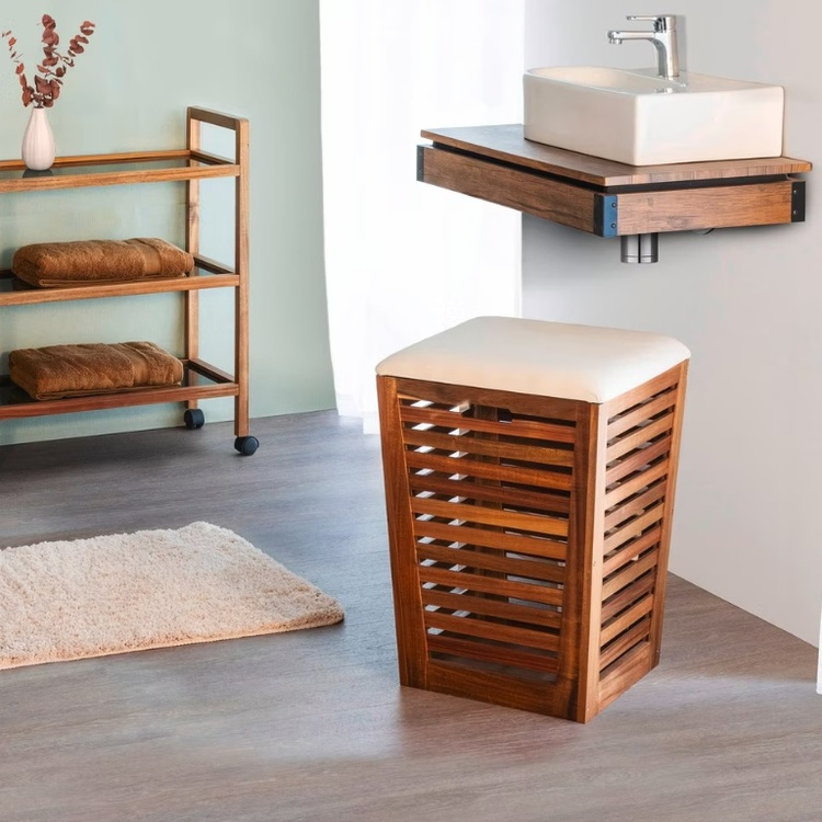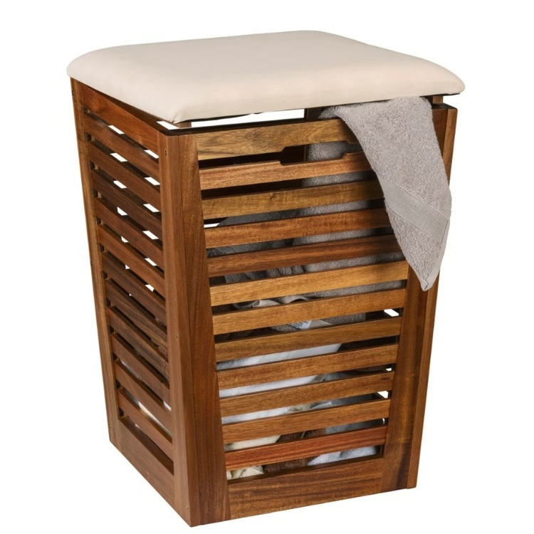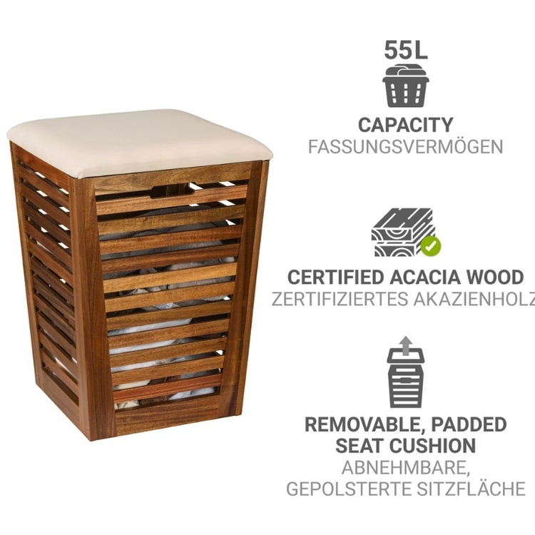 En tvättkorg i massivt akaciaträ med sittdyna.