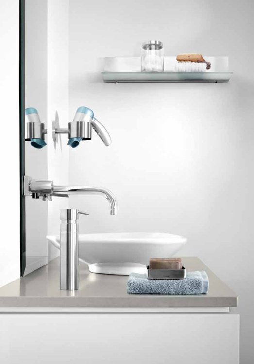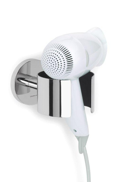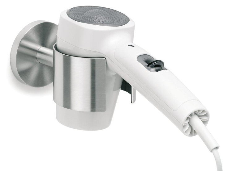 Hårtorken är en sådan där sak som aldrig riktigt hittar sitt eget ställe utan gärna återfinns lite här och där. Oftast störande på ett eller annat sätt. Med den här fina ringen av rostfritt stål monterad på väggen ramlar fönen inte ner på golvet och är inte ivägen längre.