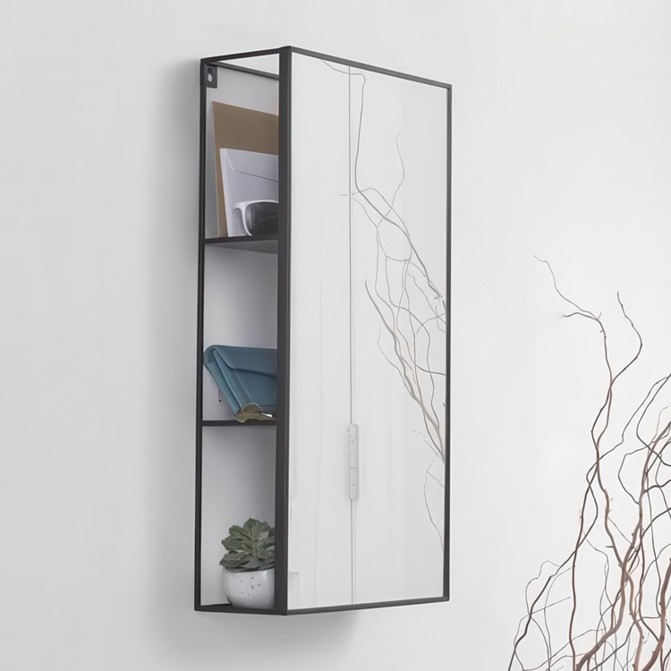 Bakom spegeln finns tre hyllor med dold förvaring.