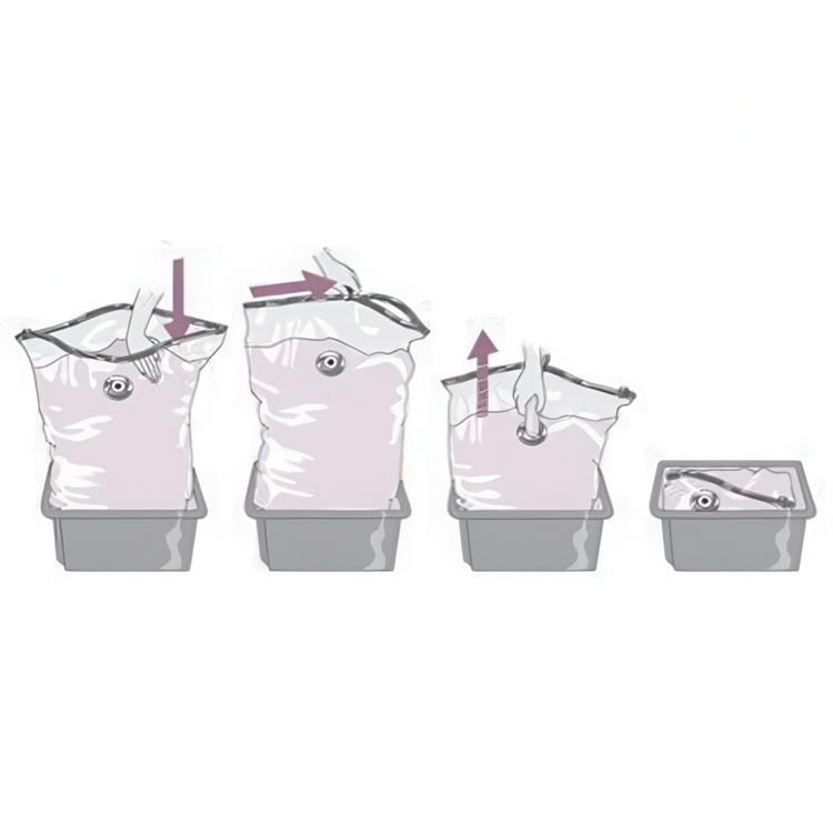 Vakuumpåsen Cube har en platt fyrkantig botten som gör att när du suger ut luften får du en kub som både kan förvaras som den är eller placeras i en kartong eller plastlåda för att göra den mer stapelbar.