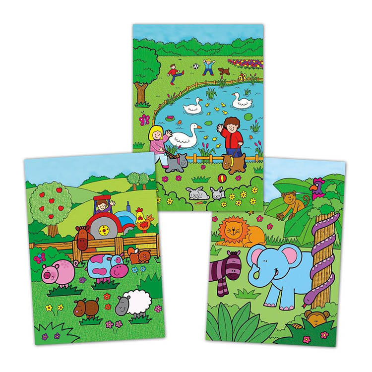Vattenmålarboken finns i de tre fantasifulla varianterna Dinosaurier, Djur, Bondgård och Pippi Långstrump. Varje bok innehåller sex återanvändbara sidor med tillhörande motiv inom respektive tema.Utformad för små barnhänder