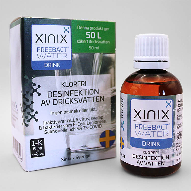 Xinix vattenrenare FreeBact Water gör osäkert vatten säkrare att dricka på bara en minut. Med några få droppar inaktiveras bakterier, virus och svamp i vatten från till exempel bäckar, sjöar eller kranar i områden där vattenkvaliteten är osäker. Behandlingen tar cirka en minut och är helt klorfri, vilket gör att vattnets naturliga smak bevaras.